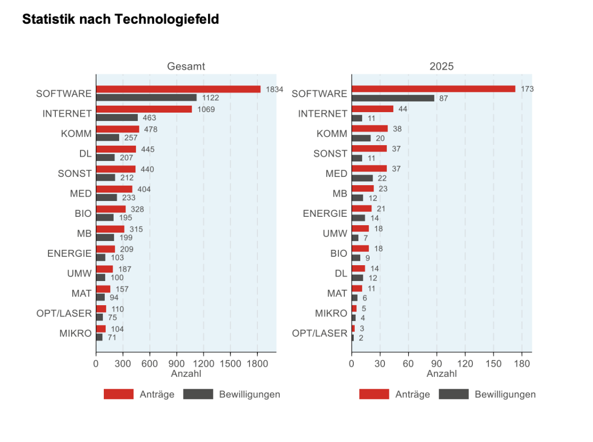 Ein Blick auf die geförderten Technologiefelder zeigt klare Schwerpunkte: Software steht mit großem Abstand an erster Stelle, sowohl insgesamt als auch im Jahr 2025. Dahinter folgen internetbasierte Geschäftsmodelle und Kommunikationstechnologien. Weitere relevante Bereiche sind Medizintechnik, Biotechnologie und Energie.