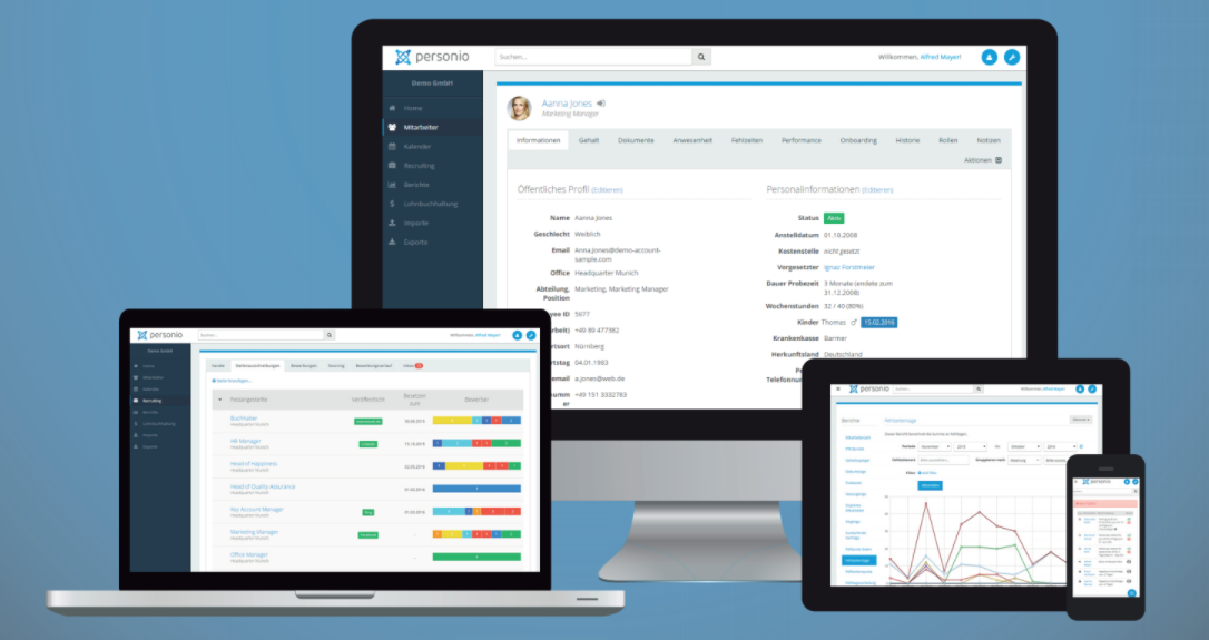 „Über unsere Lösungen können unter anderem Job-Multi-Posting, Bewerbermanagement, Mitarbeiter-Onboarding, digitale Personalakten, Urlaubsverwaltung, Genehmigungsprozesse, Gehaltsmanagement, Anwesenheitsverwaltung, Dokumentenverwaltung, Performance, Berichte, Erinnerungen sowie vorbereitende Lohnbuchhaltung abgewickelt werden.“