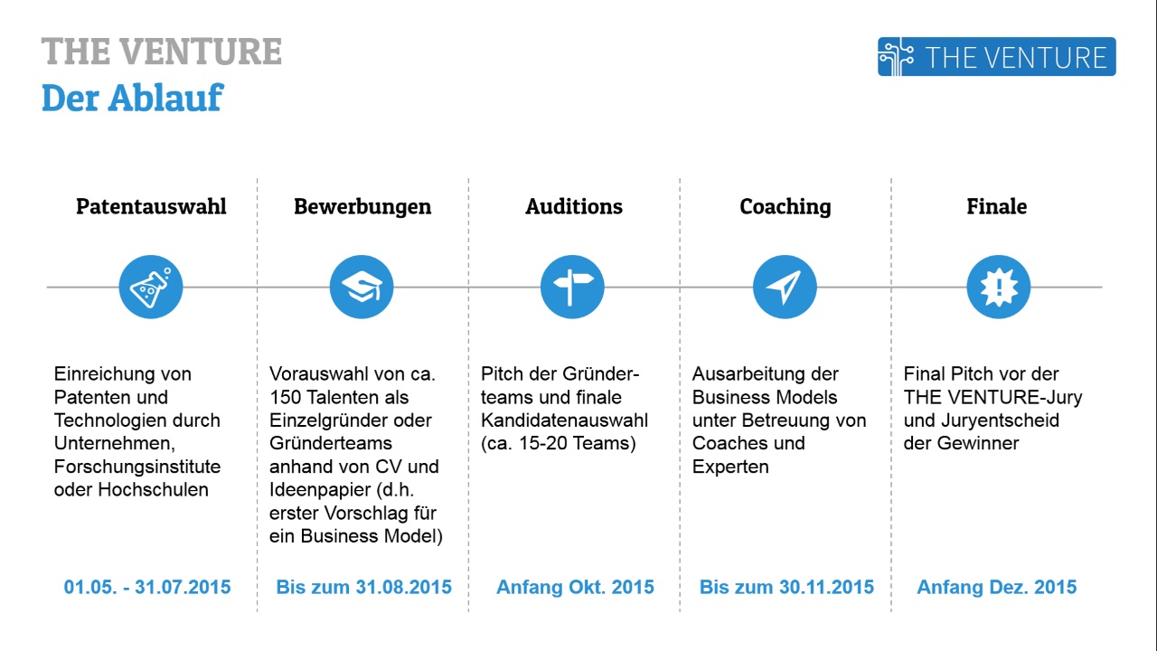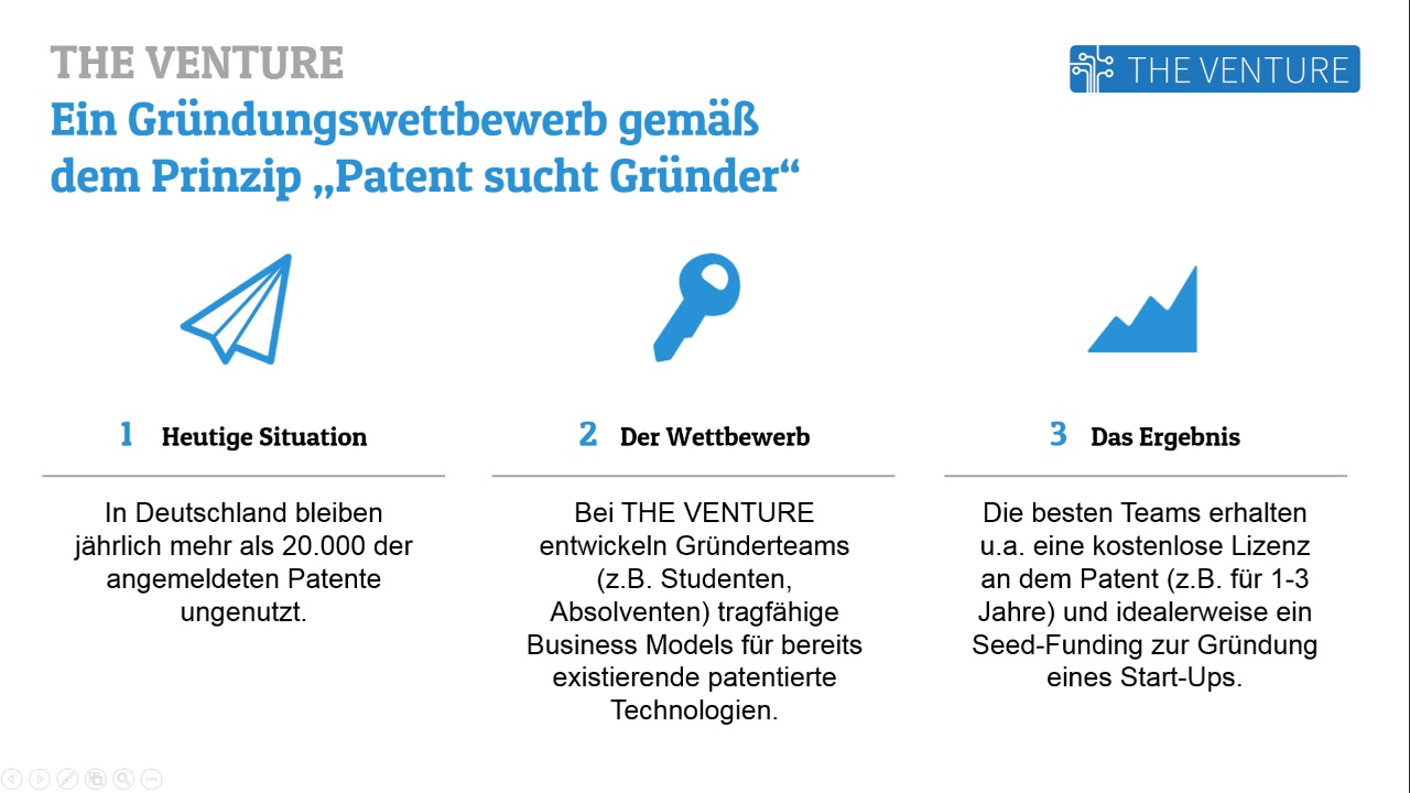THE VENTURE ist konzipiert als Gründungswettbewerb nach dem Prinzip “Patent sucht Gründer.” Studenten, Absolventen und andere Gründungsinteressierte aus Deutschland, Österreich und der Schweiz tüfteln Geschäftsmodelle aus – basierend auf vorgegebenen Patenten und Technologien.