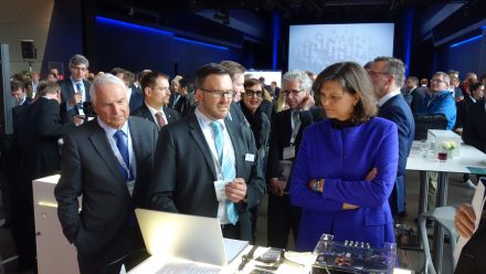 Nach Eröffnung und Begrüßung durch Wirtschaftsministerin Ilse Aigner präsentiert der Gastgeber BMW sich und seinen Stand der Digitalisierung. Jens Monsees, Digitalisierungsmanager des Münchner Autobauers, weist auf die Dringlichkeit des Themas hin: