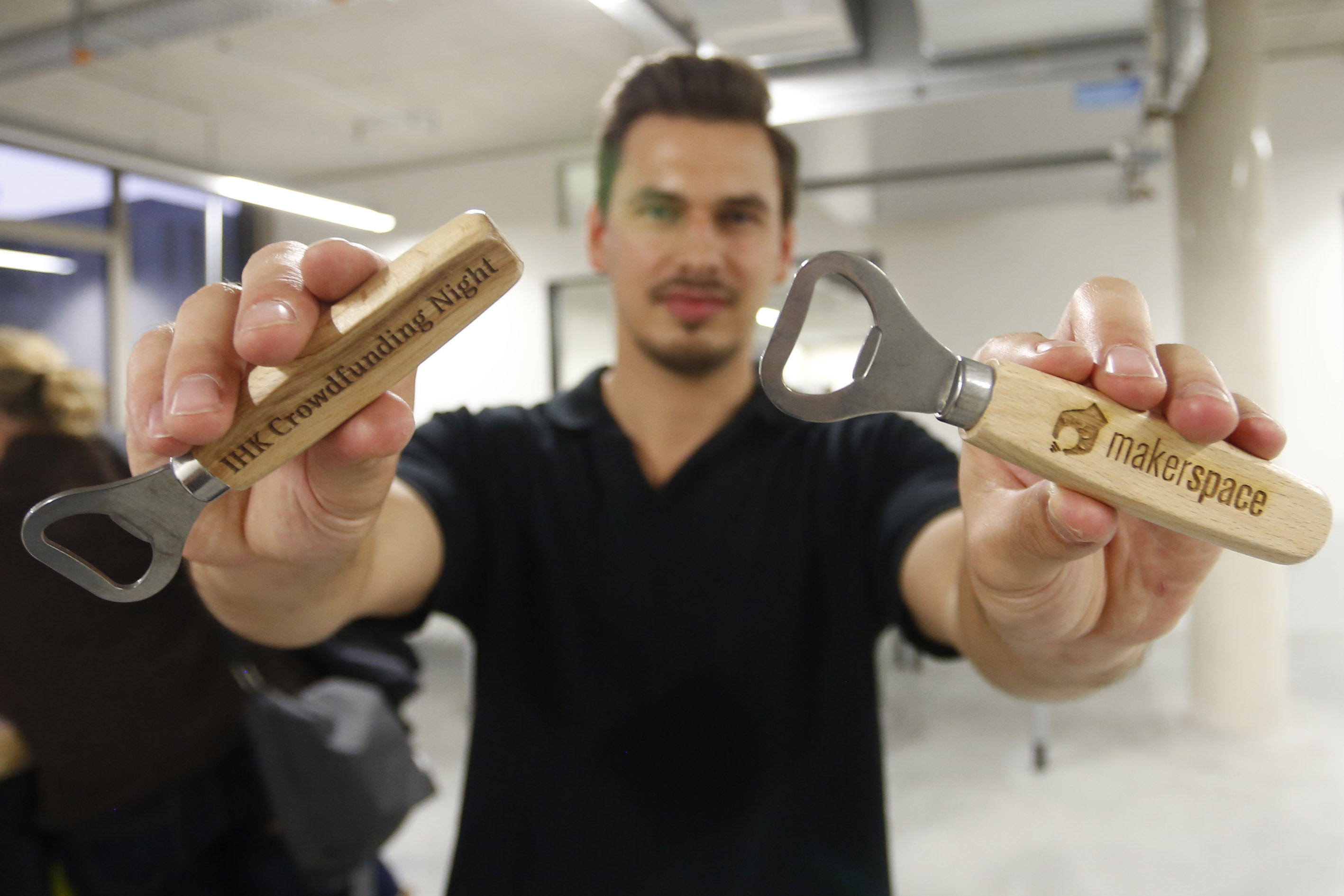 Die Crowdfunding Night klang mit einem gemeinsamen Networking aus, dabei wurden die Teilnehmer mit feinstem Munich Startup Bier, Häppchen & Eis verwöhnt. Wer Interesse hatte, konnte außerdem an einer geführten Besichtigungstour durch den frisch eröffneten MakerSpace teilnehmen und live dabei zugucken, wie sein ganz persönlicher „Crowdfunding-Night“-Flaschenöffner graviert wurde.