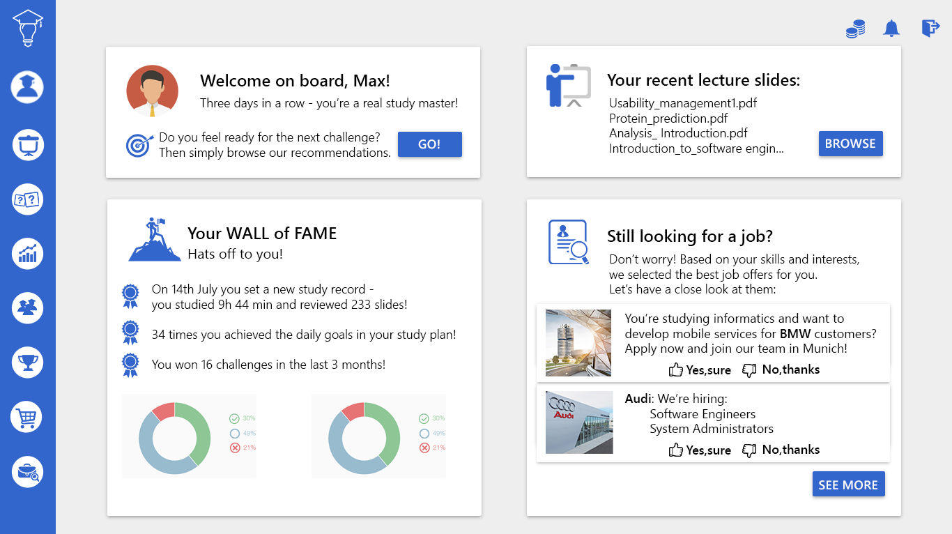 Auf der anderen Seite verbessern wir nicht nur den Effizienz-Aspekt des Lernprozesses, sondern helfen Studierenden auch dabei, ihren Lernprozess besser zu strukturieren und motivierter zu bleiben. Dies erreichen wir durch ausgeprägte Statistik und Gamification Features, die die Transparenz erhöhen und kontinuierlich Erfolgsmomente generieren.