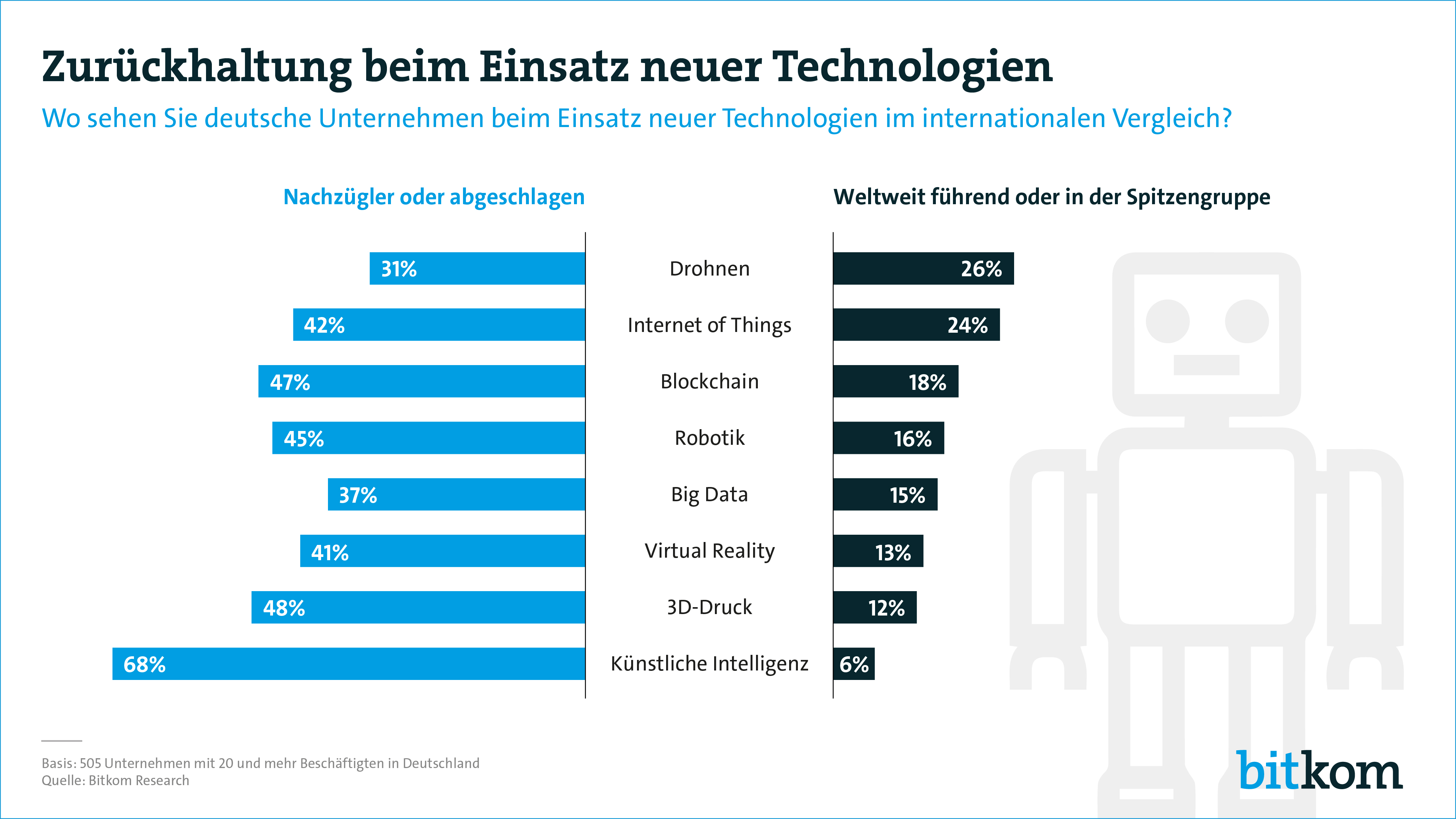 So sagen zwei Drittel (68 %) der befragten Vorstände und Geschäftsführer, dass deutsche Unternehmen bei der Nutzung von Künstlicher Intelligenz nur zu den Nachzüglern gehören oder sogar weltweit abgeschlagen sind. Rund jeder Zweite meint, dies trifft auf 3D-Druck (48 %), Blockchain (47 %) und Robotik zu (45%), nur etwas weniger sind es bei den Themen Internet of Things (42 %) und Virtual Reality (41 %) sowie Big Data (37 %) und Drohnen (31 %).