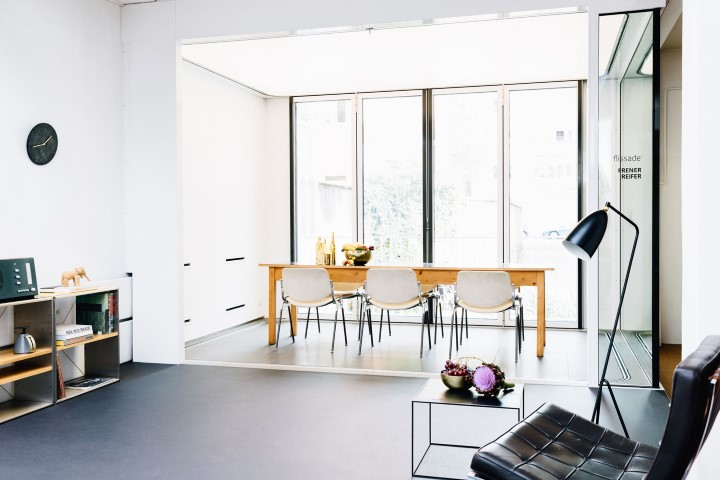 flissade will genau das überflüssig machen. Verschiebbare Glastüren schweben leicht über ein Schienensystem von innen nach außen – in Sekundenschnelle ist aus dem Balkon ein Teil des Wohnzimmers geworden. Oder aus der Restaurant-Terrasse eine Art Wintergarten. Oder aus dem Autohaus, bei dem der schicke Porsche im Freien steht, wird ein Porsche, der im flissade-Glaskasten ausgestellt ist. Oder mitten im Großraum-Büro entsteht ein abgetrennter Besprechungsraum. Oder, oder, oder… Im Gespräch wird schnell klar: Für die Architekten sind die Einsatzmöglichkeiten ihres Produkts unendlich.