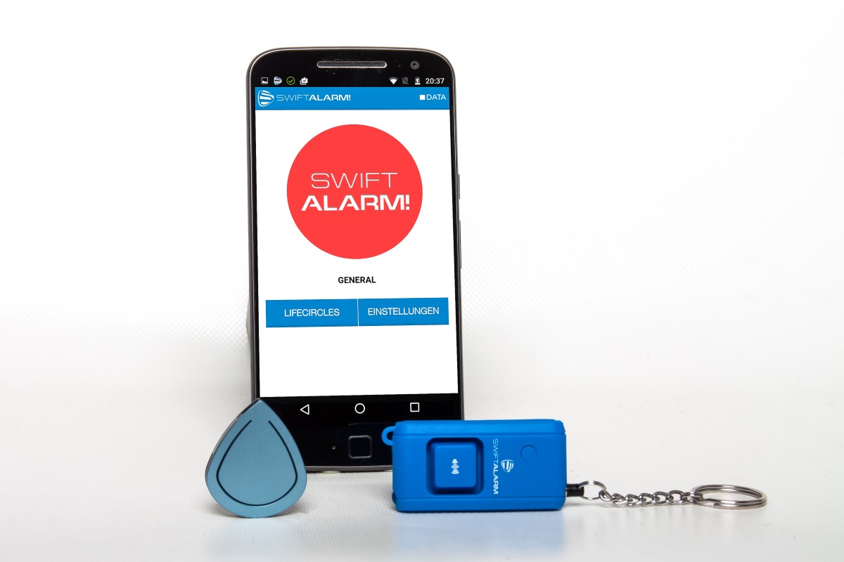Mit nur einem Klick ist die kostenlose SwiftAlarm! Gold App auf dem Smartphone installiert. Gerät man in eine Notsituation und betätigt den Alarm, werden die hinterlegten Kontakte schnell und zuverlässig per SMS über den genauen Standort des potenziellen Opfers informiert. Erweitert werden kann das System mit einer Fernbedienung und einer Sirene für den Notfall, zur Verteidigung gegen den Angreifer.