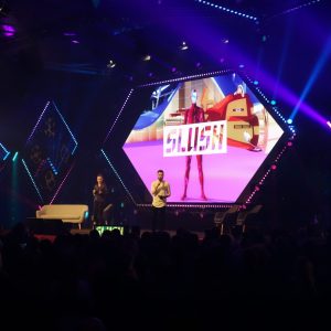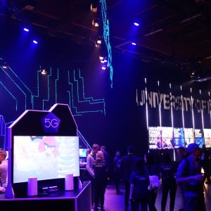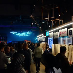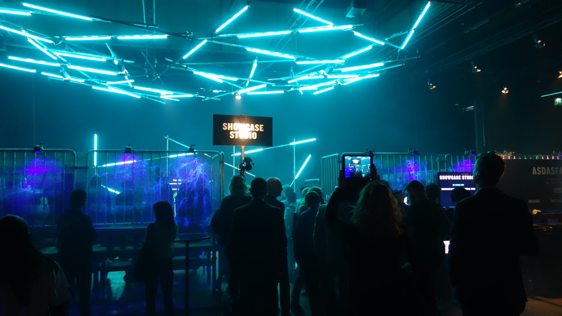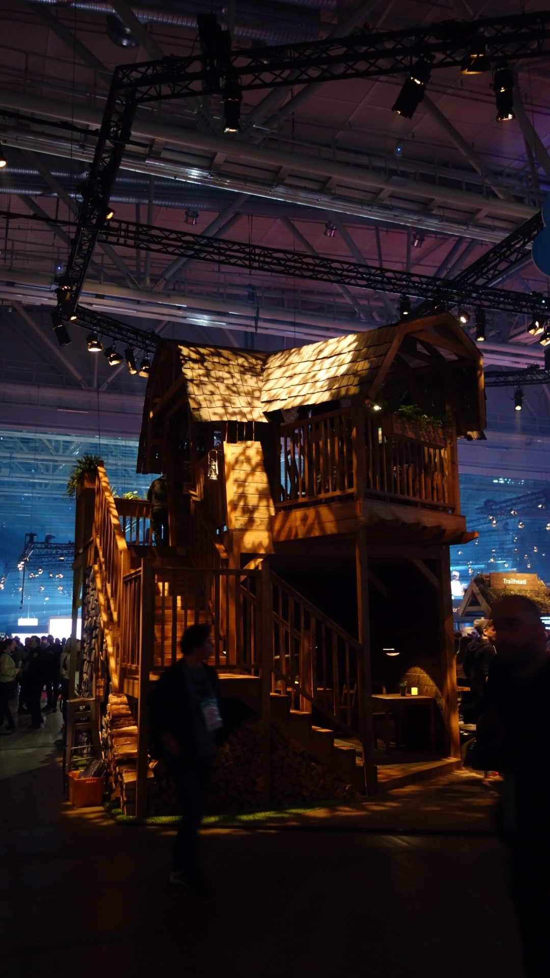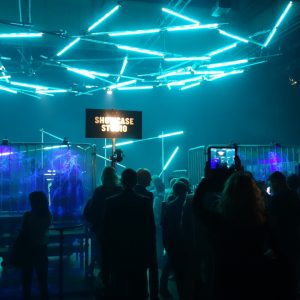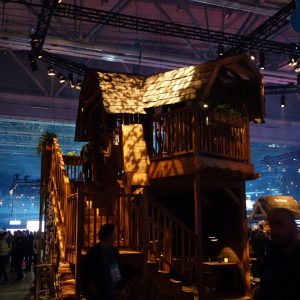 Die Messehalle ist abgedunkelt, das fahle Tageslicht bleibt draußen. Umso aufwändiger sind die verschiedenen Bereiche, Stände und Bühnen beleuchtet. Alles strahlt in Neonfarben, Bildschirme ziehen im Dunkel von selbst die Blicke an. Um gesehen zu werden, beleuchten die Aussteller ihre Stände. Die große Halle wirkt dadurch einerseits labyrinthisch, es gibt aber andererseits immer etwas zu sehen.