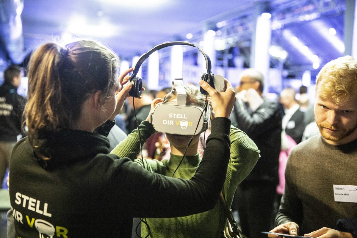 Eintauchen in andere Welten konnten die Besucher an mehreren Ständen. Das Social Startup ‚Stell Dir V(o)R‘ entwickelt immersive Lösungen für gesellschaftlicher Herausforderungen. Auf der Demo Night zeigte das Jungunternehmen Besuchern eine Pilotanwendung für die Pflegeausbildung. (Foto: Baystartup / Goran Gajanin)