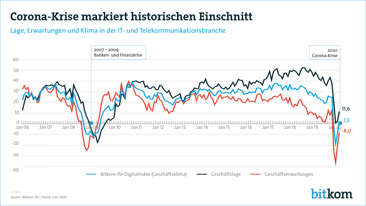 „Für die Unternehmen der Digitalbranche hat sich die Geschäftslage den zweiten Monat in Folge verbessert. Die Hoffnungen sind groß, dass der konjunkturelle Tiefpunkt der Corona-Krise für die digitale Wirtschaft überwunden ist und der allgemeine Digitalisierungsschub die Nachfrage nach digitalen Lösungen ankurbelt.“