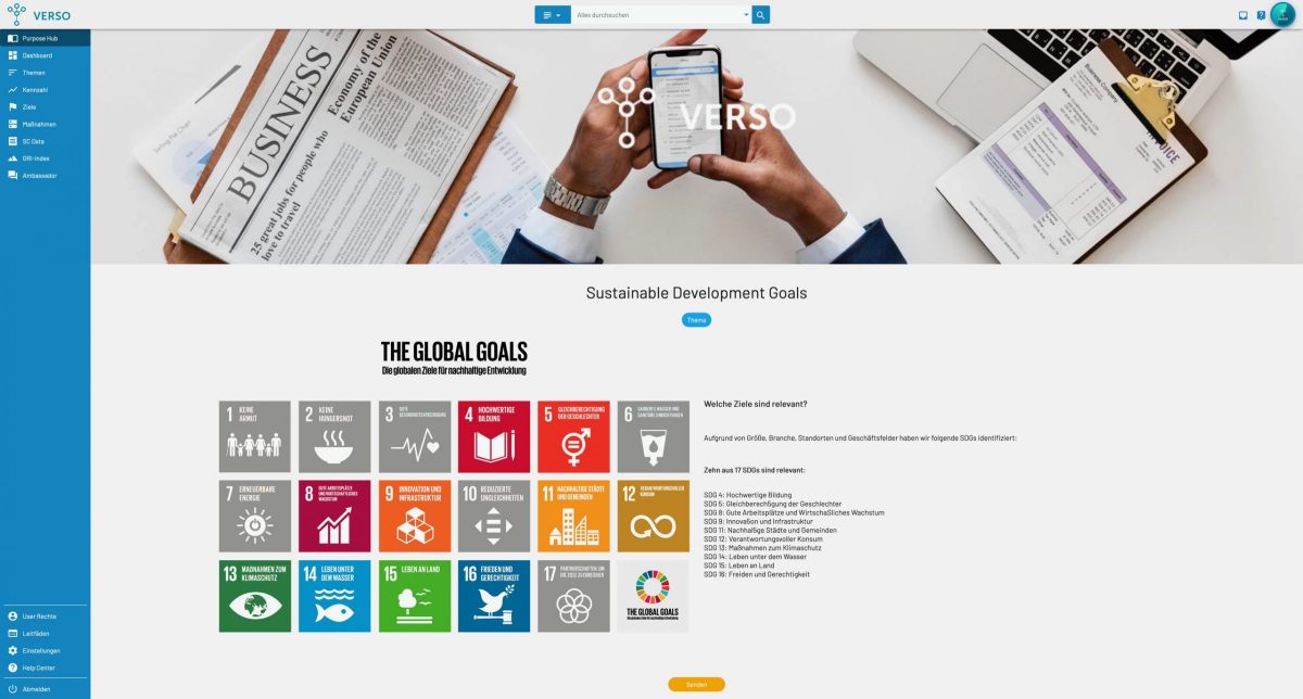 Heute ist unser Unternehmen ein komplettes CSR-Management-Cockpit für Nachhaltigkeitsbeauftragte. So unterstützen wir Unternehmen mit unseren Software- und Beratungslösungen bei der nachhaltigen Transformation der Wirtschaft. Egal ob Startup oder Großkonzern, mit Verso können Firmen Informationen rund um die Nachhaltigkeit managen und schnell an ausgewählte Stakeholder kommunizieren.