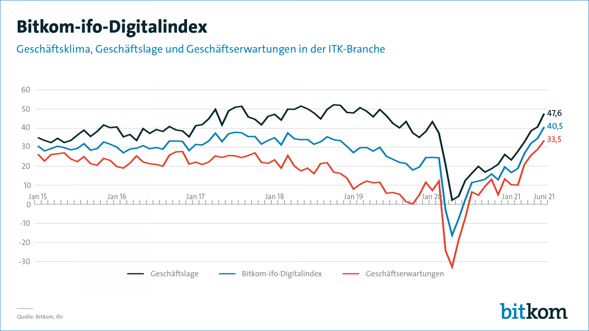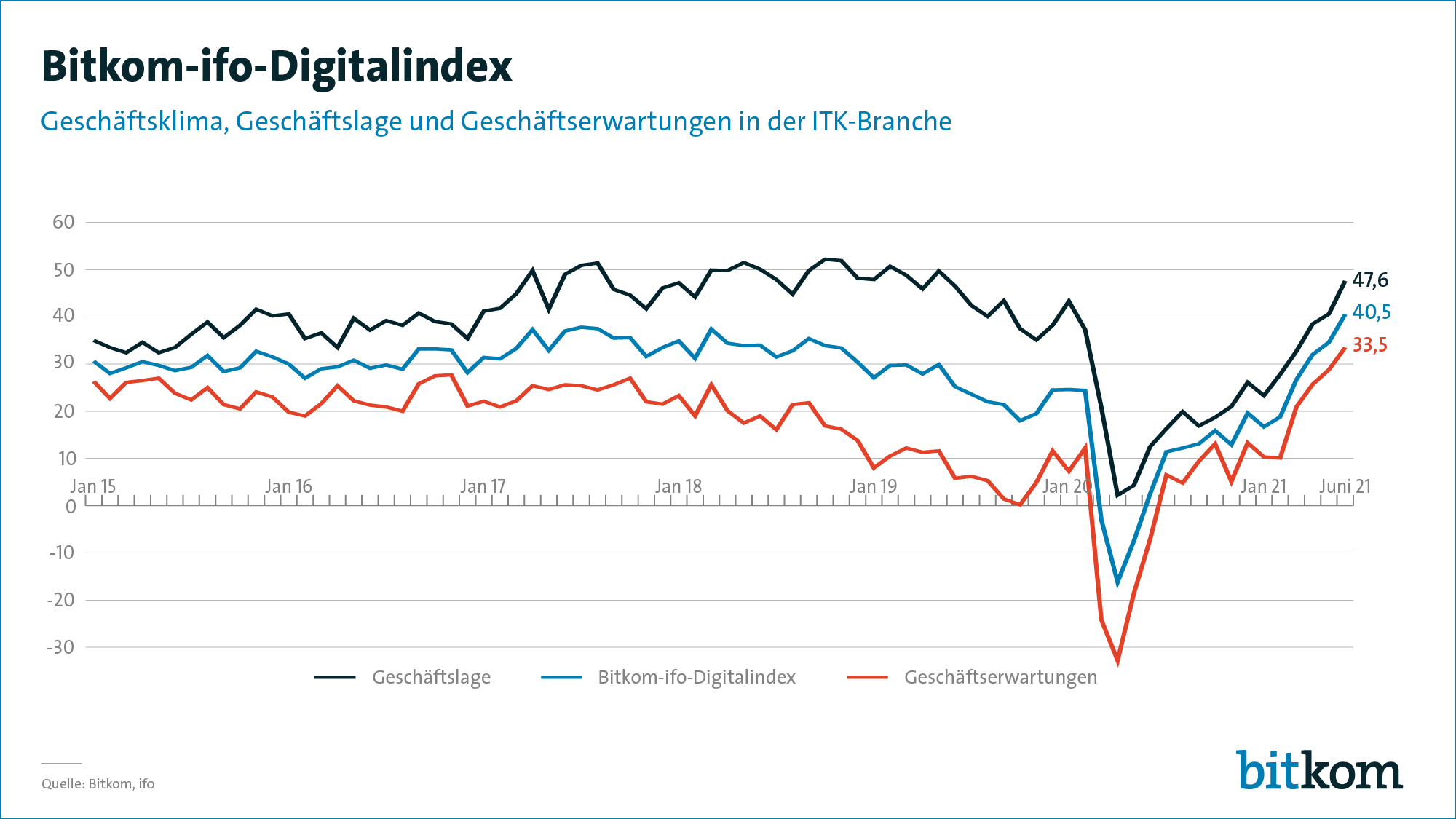 Gegenüber dem Mai steigt der Bitkom-Ifo-Digitalindex um 5,9 Punkte – den höchsten Wert seit Beginn der Erhebung im Januar 2006. Das Konjunkturbarometer bildet sich aus dem geometrischen Mittel der Werte für die Geschäftslage und die Geschäftserwartungen in der Digitalbranche. Die tatsächliche Geschäftslage steigt in nur einem Monat um 7,0 Punkte von 40,6 auf 47,6 Punkte. Die Geschäftserwartungen für die nächsten 6 Monate wächst um 4,7 Zähler von 28,8 auf 33,5 Punkte.