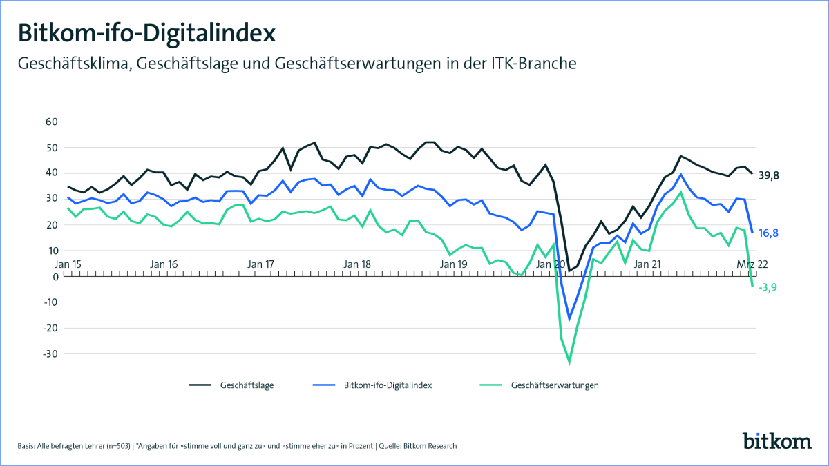 Im März ist der Index für die aktuelle Geschäftslage in der Digitalbranche um 2,8 Punkte auf 39,8 Punkte nur moderat gefallen. Dramatisch dagegen sind die Einbrüche bei den Erwartungen von Digitalunternehmen für die nahe Zukunft: Der Index der Geschäftserwartungen für die kommenden sechs Monate ist im März um 21,8 Punkte abgestürzt und liegt mit -3,9 Punkten erstmals seit Juni 2020 wieder im negativen Bereich. Der Bitkom-Ifo-Digitalindex, der sich aus der Geschäftslage und den Geschäftserwartungen berechnet, ging um 13,1 Punkte zurück und notiert nun bei 16,8 Punkten.