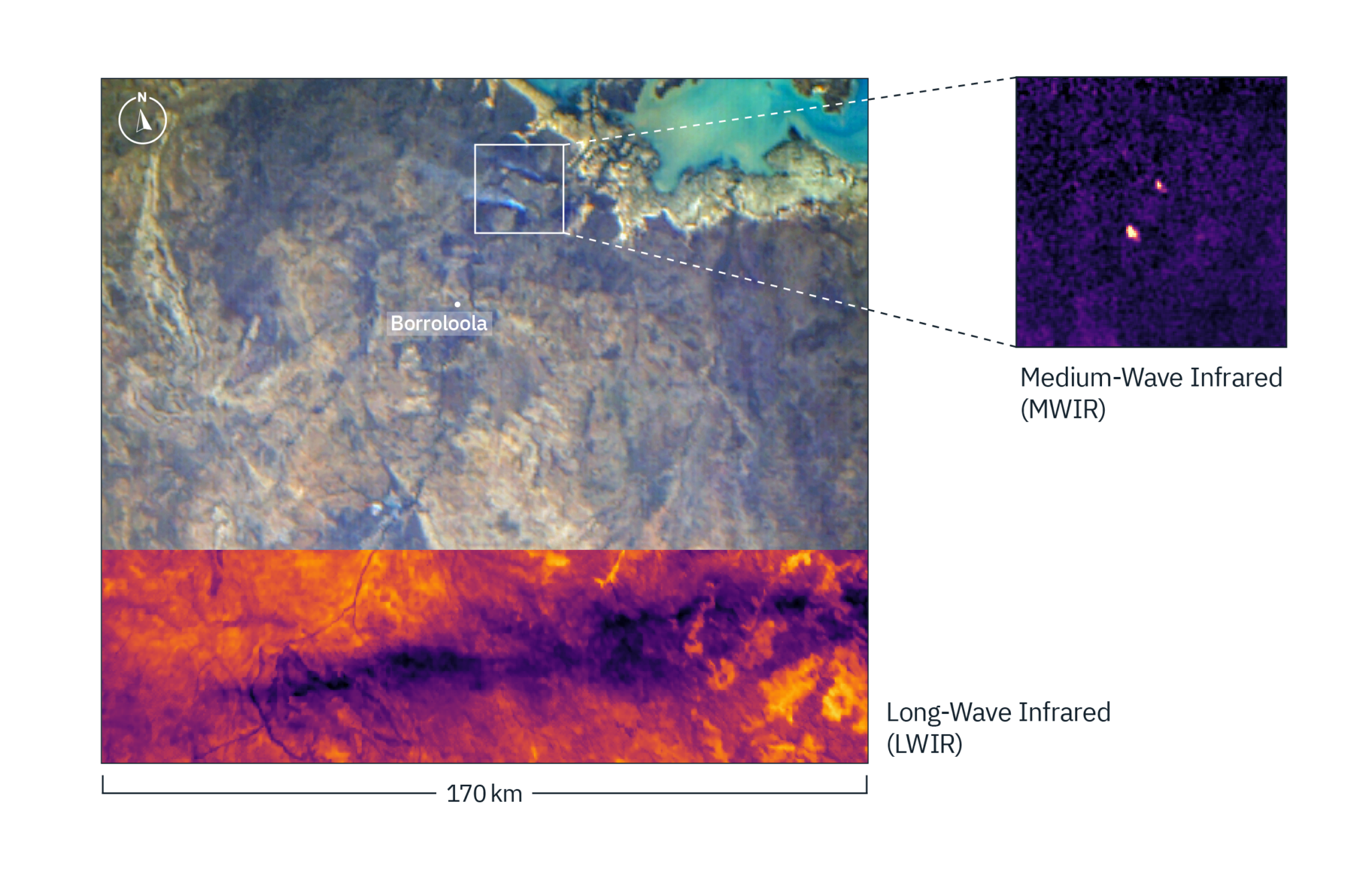 Buschbrände in Borroloola, Australian, erkannt von Ororatechs Forest-1 Satellit am 24. Mai. Das Bild zeigt Aufnahmen der drei Hauptinstrumente an Bord mit einer Schwadbreite von 170 km. Die Rauchwolken der Feuer sind im sichtbaren Spektrum zu erkennen, während der Mittelwellen-Infrarot (MWIR) Kanal exakte Hitzesignaturen zeigt. Der Langwellen-Infrarot (LWIR) Kanal, eingefügt im unteren Bildbereich, erlaubt genaue Messungen der Temperatur am Boden. © Ororatech