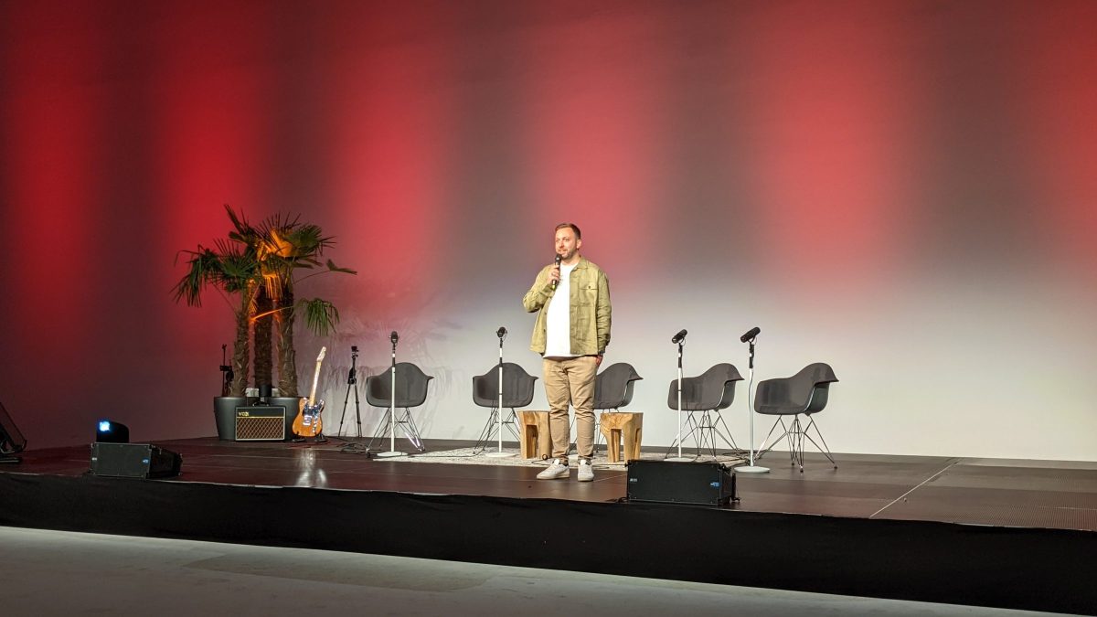 Der Veranstalter Daniel Fürg begrüßt das Publikum und spricht über aktuelle Krisen und neue Herausforderungen. Die großen globalen Krisen stecken das thematische Terrain der Konferenz ab: Corona, der russische Krieg in der Ukraine, Fake News und der Klimawandel bestimmen eine Vielzahl der Panels. (Foto: S.Tischer – Munich Startup)