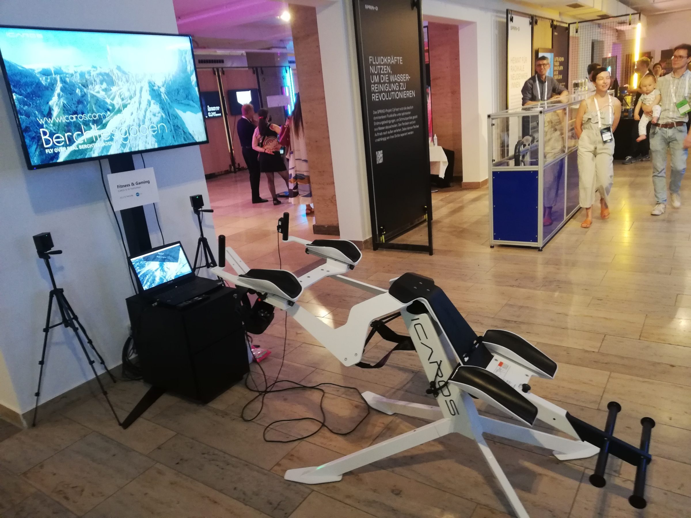 Zum Anfassen und Ausprobieren hat auch 3D Reality Maps einiges im Gepäck. Das Unternehmen aus München vermisst Gelände mit Flugzeugen und Drohnen und erzeugt realistische 3D-Umgebungen. Diese kommen dann zum Beispiel bei der Darstellung der Gletscherschmelze durch den Klimawandel zum Einsatz oder auch bei Icaros, dem Münchner VR-Fitness-Startup. Besucher der Ausstellung können mit dem Gerät virtuell durch die Berchtesgadener Berge fliegen – was deutlich mehr anstrengt als man glaubt. (Foto: M. Feigl – Munich Startup)