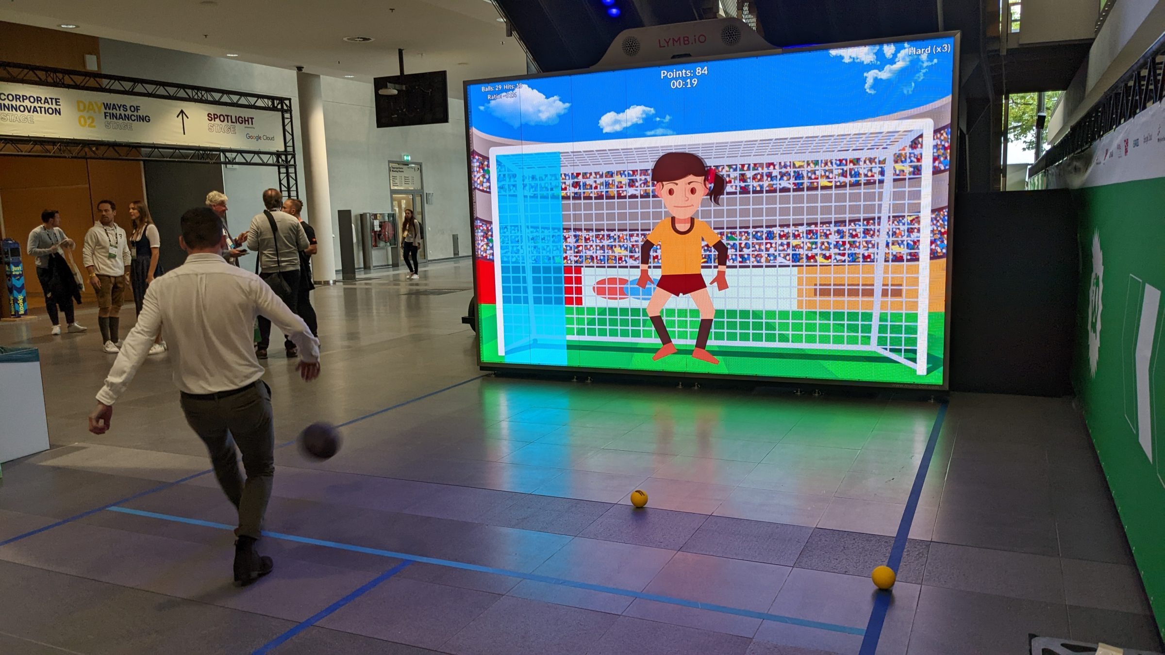 … bis zur großflächigen Demo. So können Besucher das Bewegungsspiel von Lymb.io live ausprobieren. Beim Torwandschießen messen Sensoren, an welcher Stelle der Ball eingeschlagen ist und vergeben Punkte abhängig davon, ob die Torhüterin überwunden werden konnte.