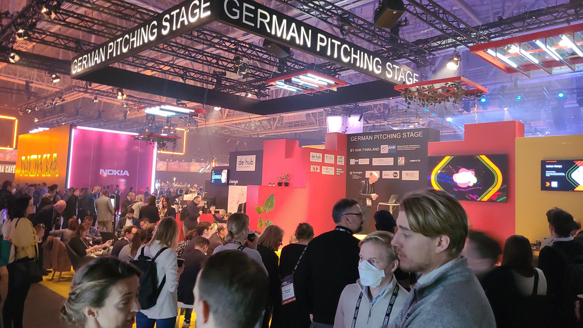 Gegenüber des Munich-Startup-Stands pitchen deutsche Startups auf der German Pitching Stage. Zwei Tage lang stellen hier GründerInnen sich und ihre Ideen vor. Mit rund 30 Quadratmetern mehr Fläche als noch im letzten Jahr haben die Organisatoren rund um die AHK Finnland hier einen weiteren Hotspot der Messe geschaffen. (Bild: Munich Startup)