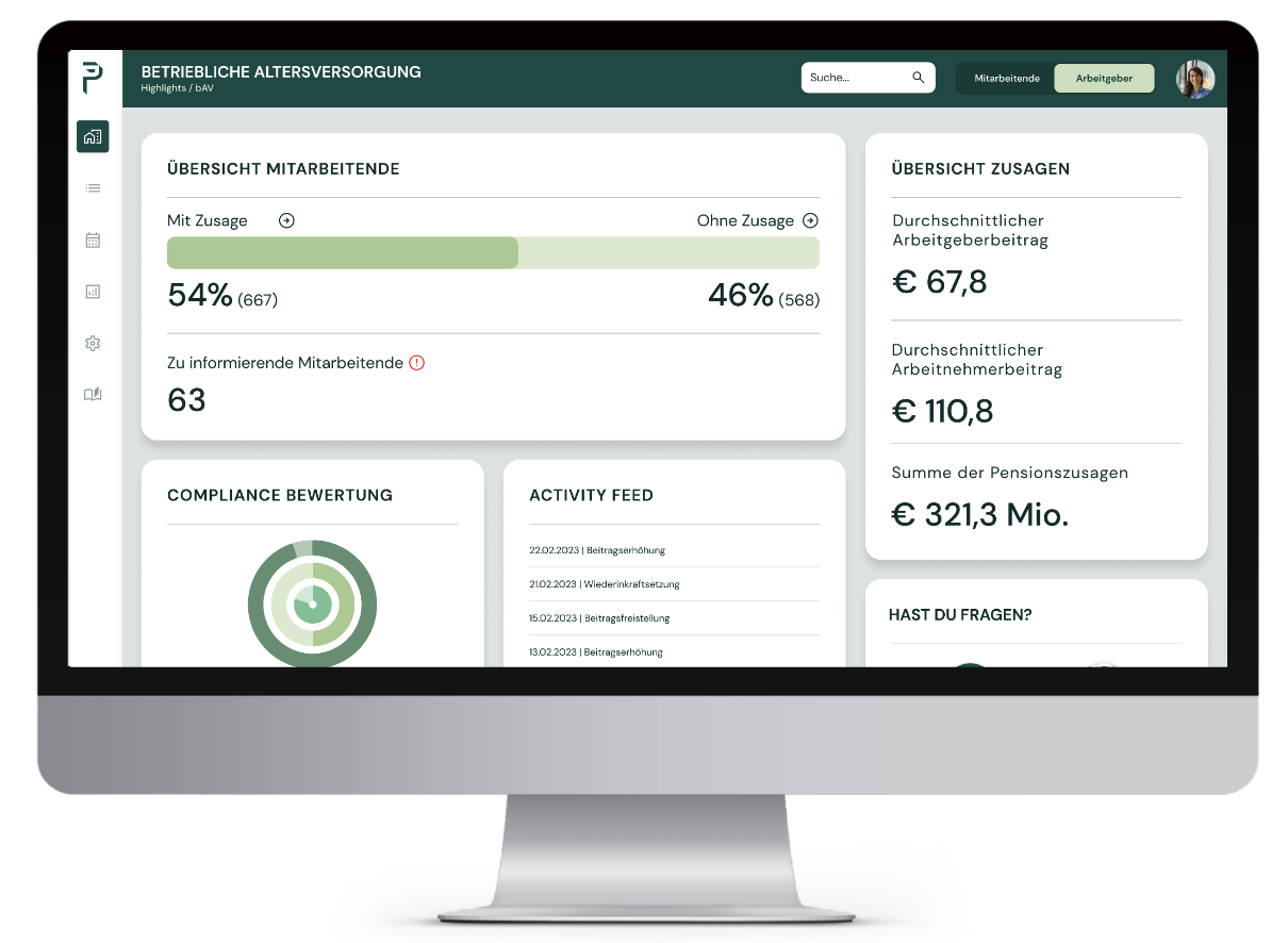 Penzilla integriert sich ins Human Resources-(HR)-System, digitalisiert vorhandene bAV-Verträge und verschafft HR-Angestellten einen Überblick über alle im Unternehmen vorhandenen Versorgungsordnungen. Darüber hinaus entlasten wir HR vom administrativen Aufwand, denn Mitarbeitende können eigenständig ihre Versorgung und die damit verbundene Leistung einsehen. Und wenn es Änderungsbedarf gibt, können sie sich auch eigenhändig einen Termin bei ihrer bAV-Ansprechperson buchen. Wir nehmen der Personalabteilung die Unsicherheit im Umgang mit dem Thema und den Verwaltungsaufwand ab. Ganz nebenbei helfen wir Unternehmen dabei, Lohnkosten einzusparen. Denn wenn Angestellte über das Unternehmen für die Rente sparen, fallen auch für den Arbeitgeber weniger Sozialversicherungsbeiträge an.