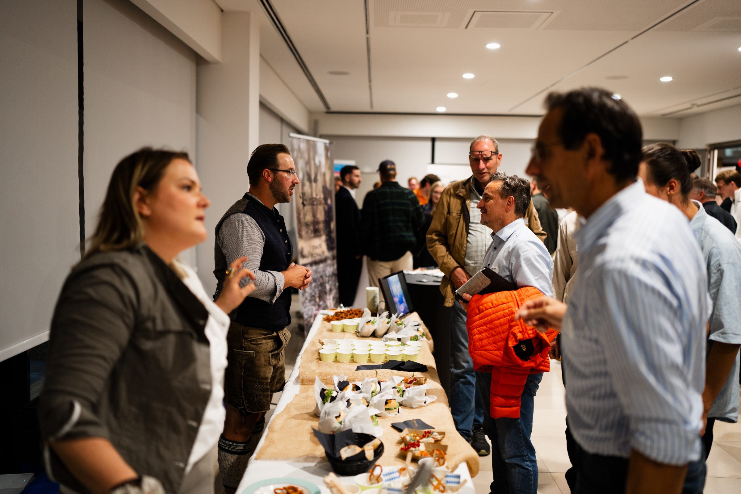 Anschließend wurde der Raum gewechselt, im Erdgeschoss der HWK waren die lokalen Schmankerl bereits aufgebaut. In diesem Jahr lag der Fokus Essens-technisch auf dem Fisch vom Platzfisch aus Mittenwald. (Foto: Lukas Lindner / Munich Startup)