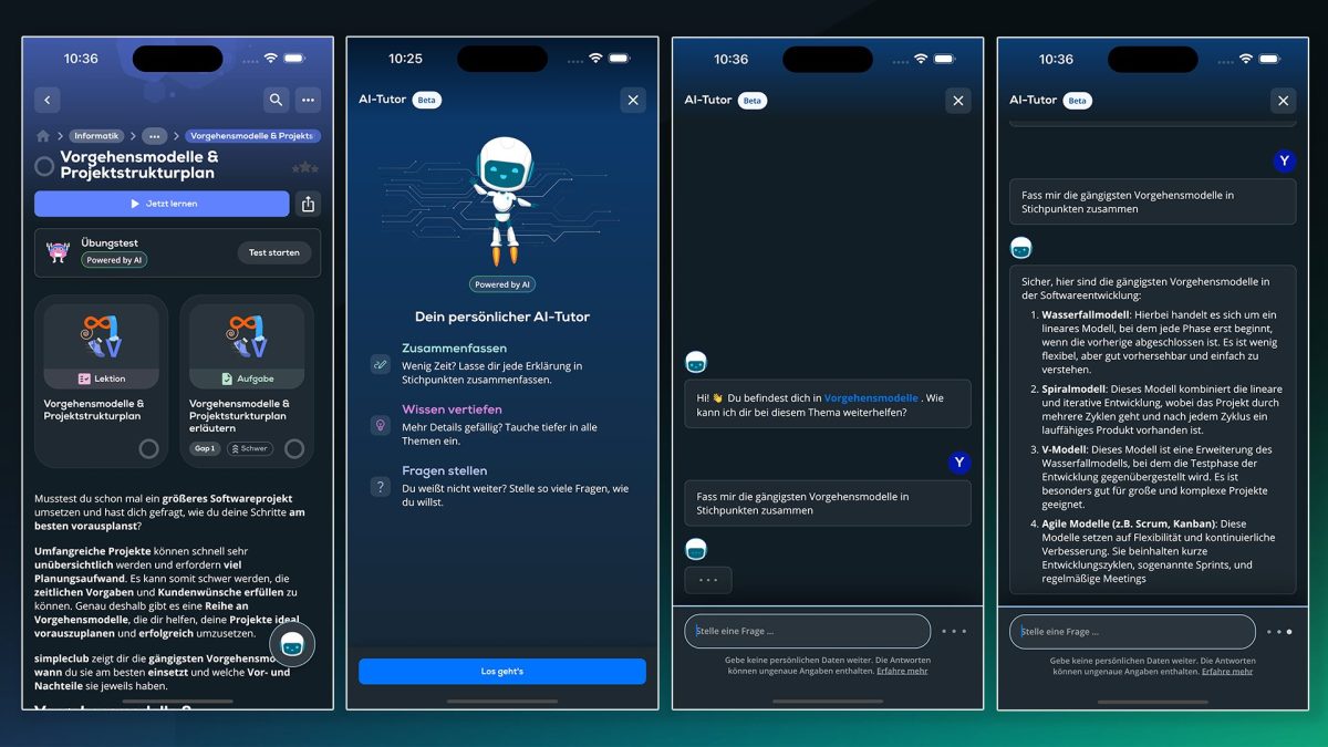 Das Münchner Unternehmen setzt Künstliche Intelligenz schon länger gezielt zur Skalierung der bereitgestellten Inhalte ein. So füttert Simpleclub etwa seine KI mit den Inhalten seiner Lernbibliothek, um sie neue Beiträge von hoher Qualität erstellen zu lassen.  Nach diesem Prinzip wurde im Sommer dieses Jahres bereits ein KI-Prüfungsmodus entwickelt, indem sich Lernende mit unbegrenzten KI-angepassten Übungsaufgaben auf ihre nächste Prüfung vorbereiten können. Dabei werden alle KI-generierten Inhalte klar gekennzeichnet, um als solche erkennbar zu sein.