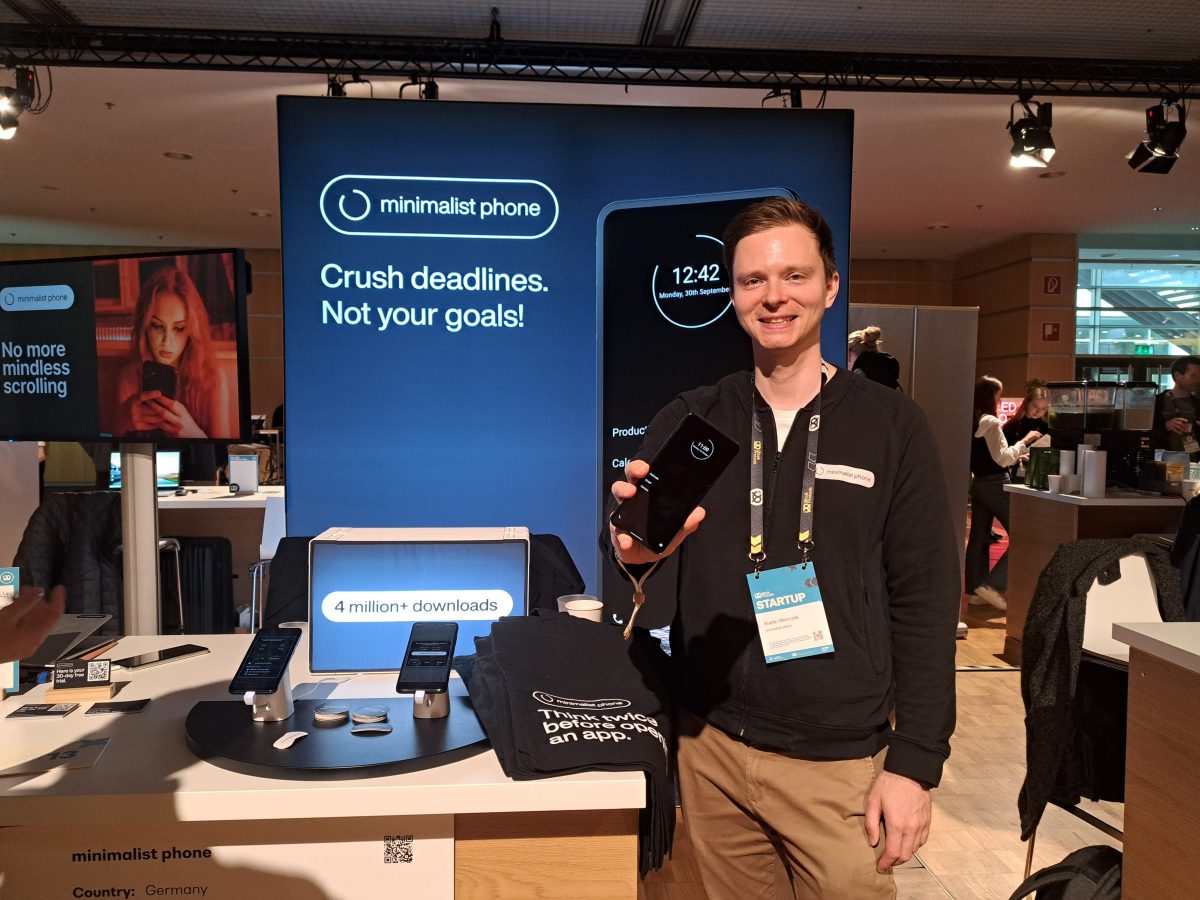The topic of mobile phone use is likely a constant pain for many Bits & Pretzels visitors—and beyond. By the time the weekly report appears on the screen, some people are regularly promising to improve. A startup founded in 2022 presents a solution that could really help. Minimalist Phone at this year's Bits & Pretzels. Once installed, the minimalist app changes the phone's user interface so that the icons disappear. “When the icons are no longer visible, you no longer open apps like Instagram without thinking.”, explains founder Martin Moravek in conversation with Munich Startup. The app also has other features designed to make life more difficult for mobile phone users in a positive way: the usage times of individual apps can be restricted, apps can be blocked for longer periods, or displayed only in black and white – which makes image-driven apps like Instagram significantly less attractive. The Minimalist Phone founder primarily expects Bits to draw more attention to the topic of mobile phone use – and, of course, to his startup as well. (Photo: Munich Startup)