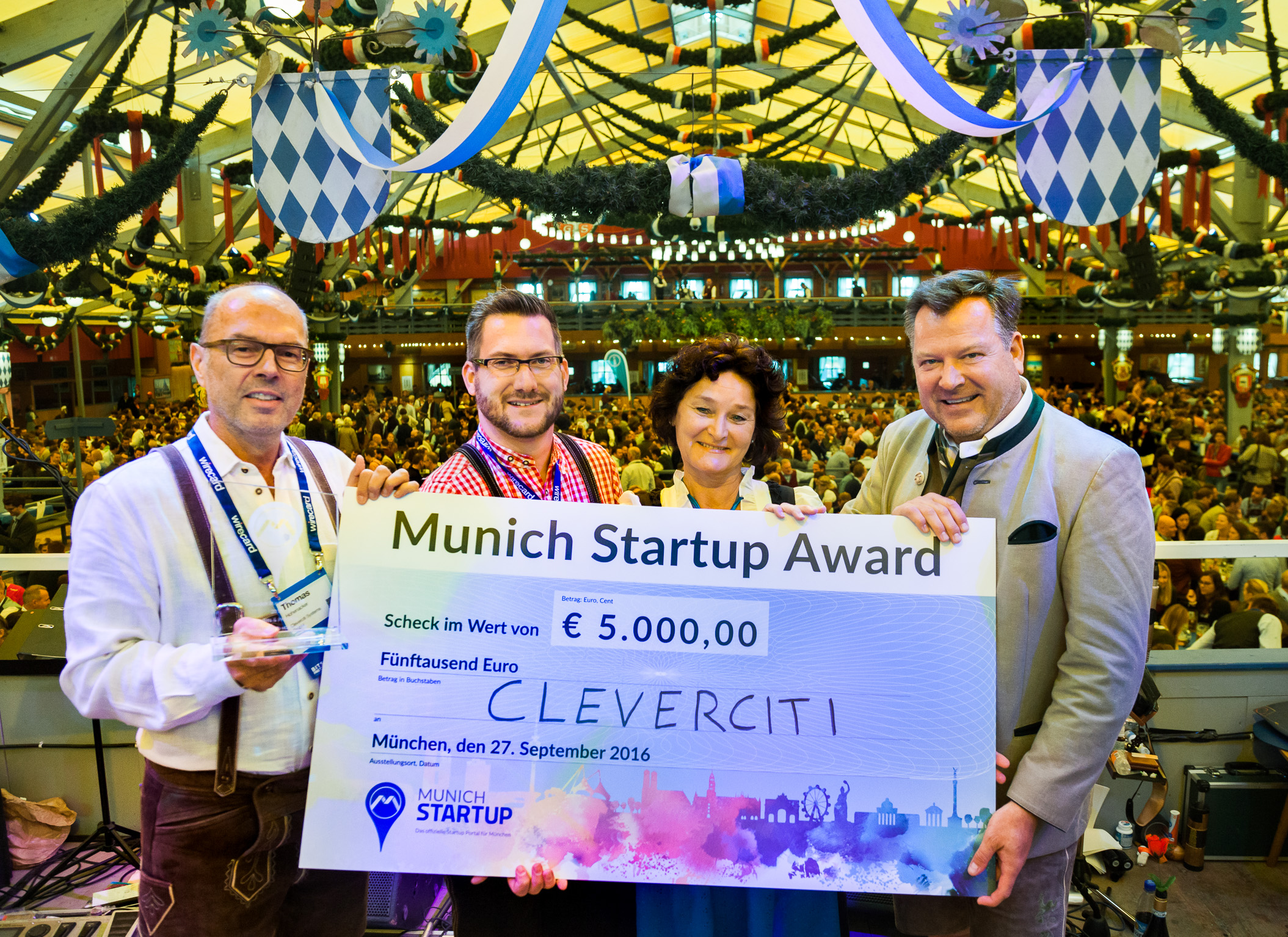 On 27 September, Munich’s Mayor Schmid presented the 1st Munich Startup Award, endowed with 5,000 euros, at the Founder Festival Bits & Pretzels. Winner is Cleverciti Systems.