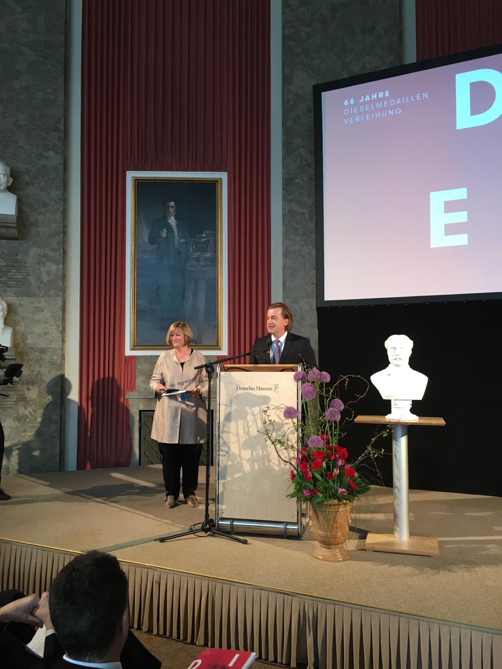 Over 200 invited personalities from the German innovation scene attended the ceremony in the Hall of Honor of the Deutsches Museum in Munich. Together with Dr. jur. Heiner Pollert, Chairman of the Diesel Medal's sponsoring association, the German Institute of Inventions, the spokesperson of the Diesel Board, Prof. Dr. Alexander J. Wurzer, presented the Diesel Medal for "Best Innovation Promotion" to Stefanie Herrmann (CFO) and Thorsten Rudolph (CEO) of AZO.